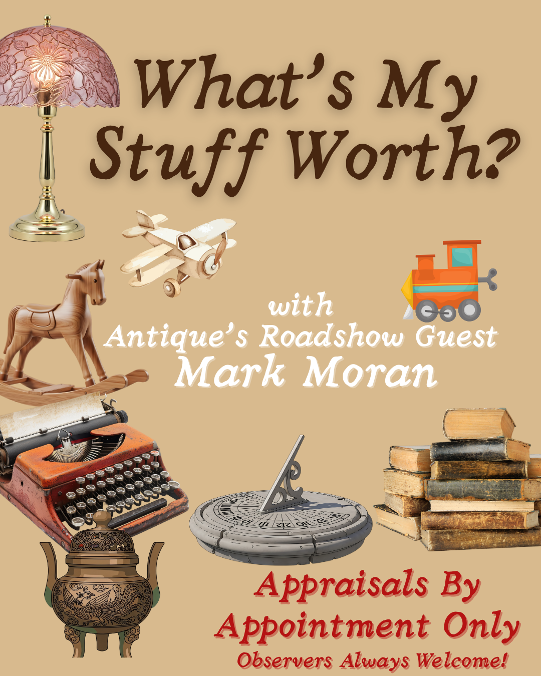 What’s My Stuff Worth? Mark Moran joins us for an antique and appraisal event. Reservations required! Call for details. + Add to Google Calendar + iCal / Outlook export Date Nov 10 2025 Time 4:00 pm - 7:00 pm Location Shawano Library 128 S Sawyer St, Shawano, WI Phone 715-526-3829 Share this event